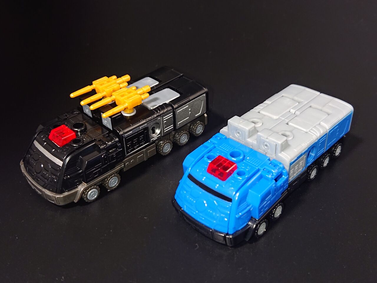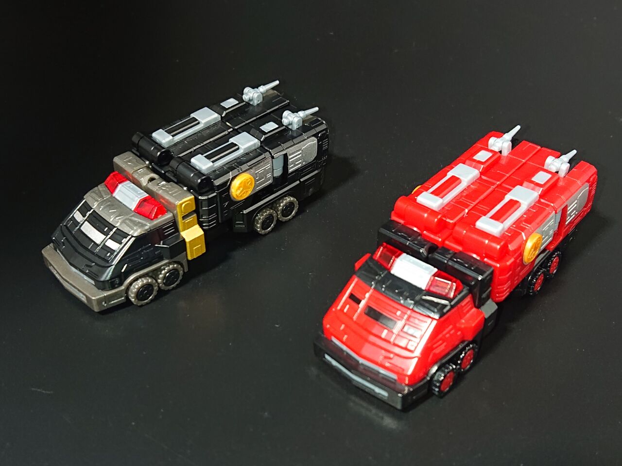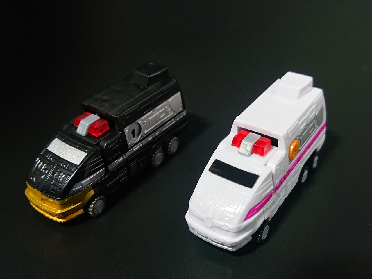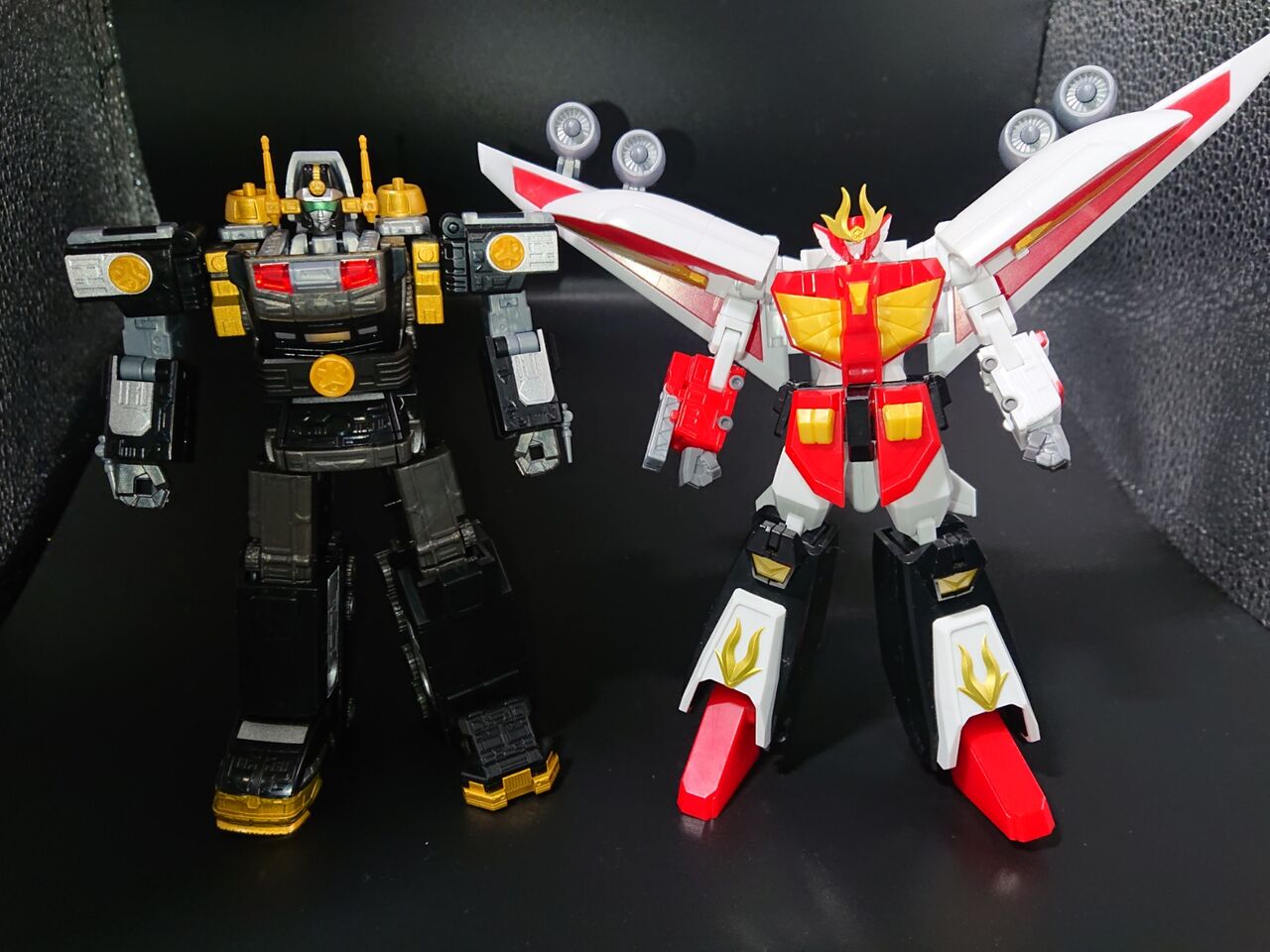対称的な白いカラーリングのファイヤーダグオンと比較。アニメロボと特撮メカでスーパーミニプラのアプローチの方向性が違うのがわかります